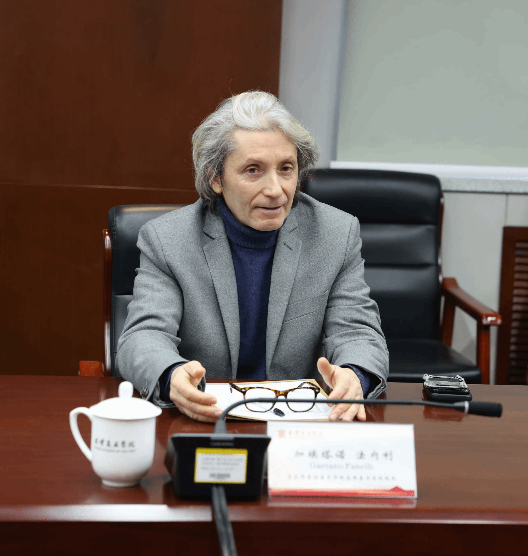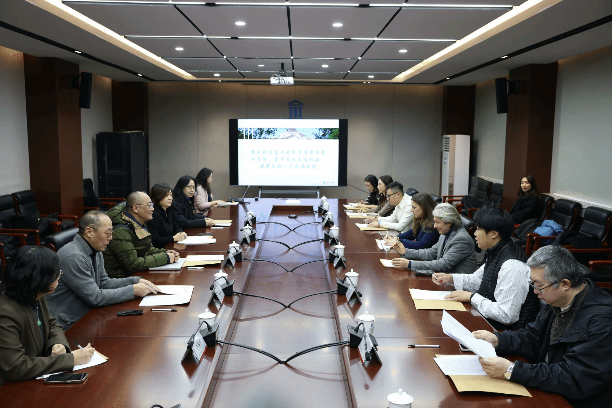 2025年1月9日,米兰布雷拉美术学院应用美术学院院长加埃塔诺-法内利(Gaetano Fanelli)、米兰布雷拉美术学院应用美术学院教授朱莉亚娜-斯多利诺(Giuliana Storino)、意中文化交流协会副会长刘程、天津津湾文化旅游发展有限公司首席执行官孙璐等一行8人来校交流访问。院长邱志杰会见来宾并举行座谈。