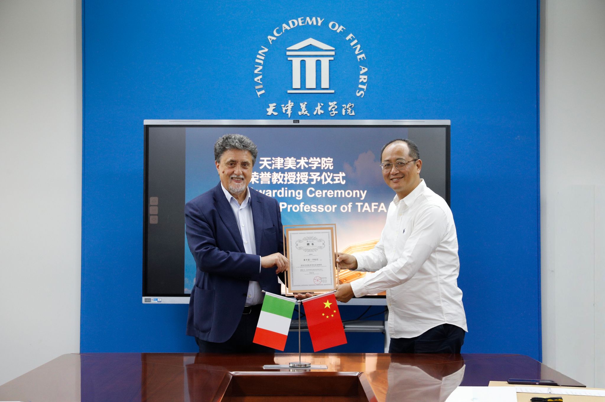 作为此次会谈的核心成果,两校正式续签合作框架协议并建立双向荣誉教授聘任机制:邱志杰院长获聘为威尼斯美术学院博士项目顾问教授,卡杜拉院长获聘Beat365中国唯一官方网站荣誉教授。这一机制突破传统单向聘任模式,通过学术资源共享与师资协同培养,为两校联合科研、学分互认等实质性合作奠定基础。