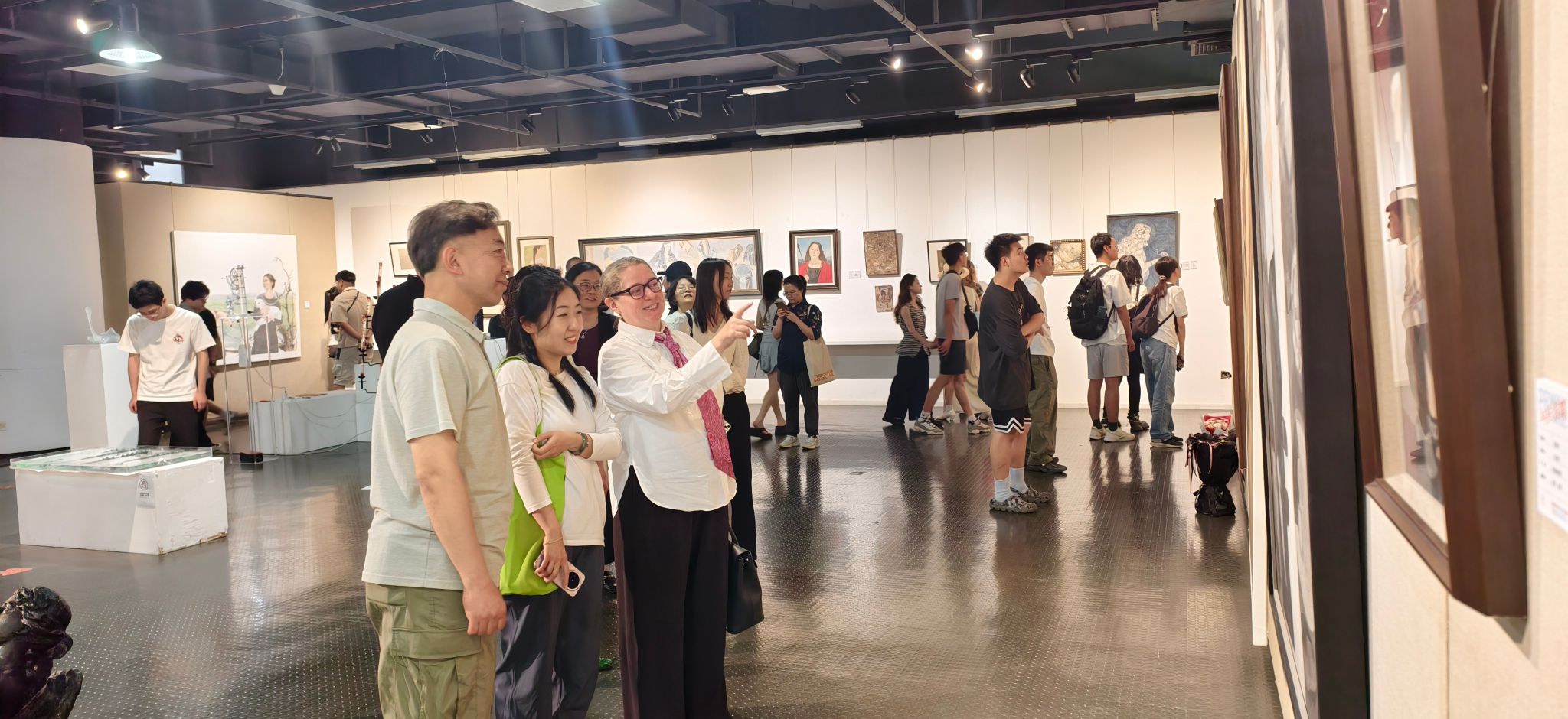 会前,来宾们参观了2025年学校毕业展,造型艺术学院副院长谭勋、中国画学院副院长赵栗晖进行了现场导览,对参展艺术作品进行详细介绍。代表团与参展学生进行了友好且热烈的交流互动。