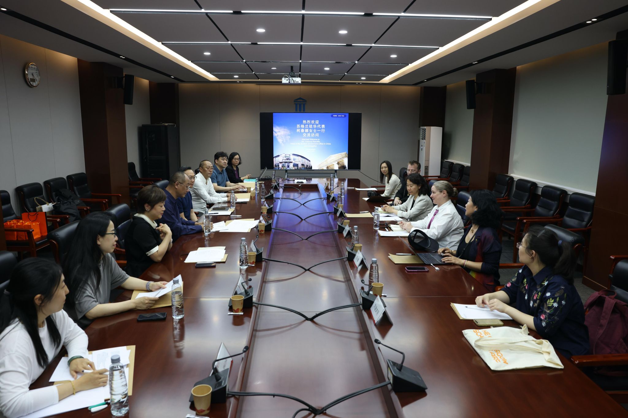 在会谈中,格拉斯哥美术学院亚洲首席代表王小爱从学科建设、师资队伍、科研创新等方面进行了分享。两校与会人员重点围绕联合培养项目、科研人才交流展开了深入讨论。座谈会由国际交流处处长沈岩主持。
