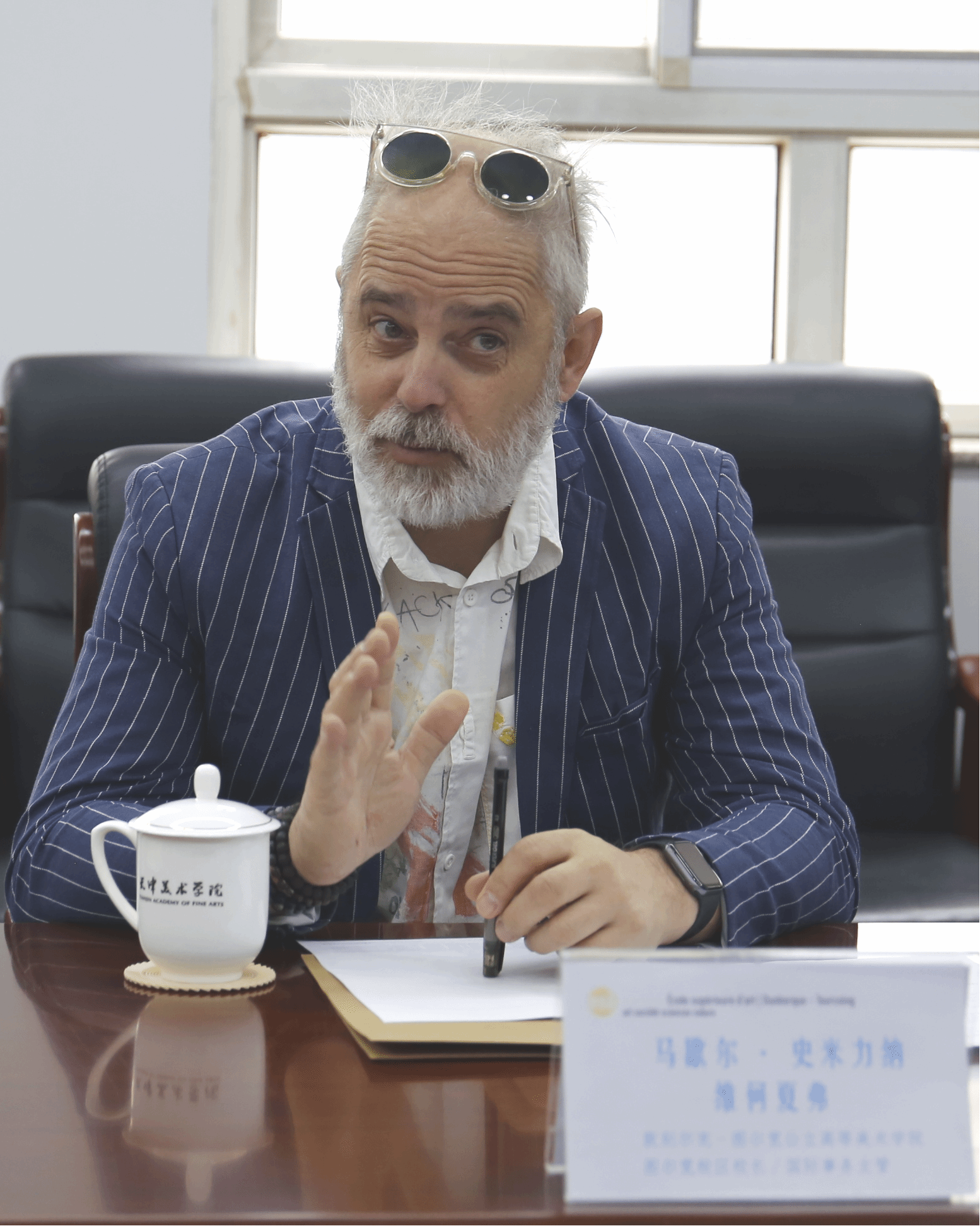 贾广健院长代表学校向Martial副院长表示诚挚的欢迎,随后介绍了近几年学校发展、学科建设、国际教育与合作交流等方面取得的成效。他表示近年来中法两国积极推进高等教育领域的交流与合作,这样良好的背景为双方深入合作创造了平台。天津美院珍视彼此间持久互信的合作,对未来开展更多形式、更高质量的合作充满信心。
