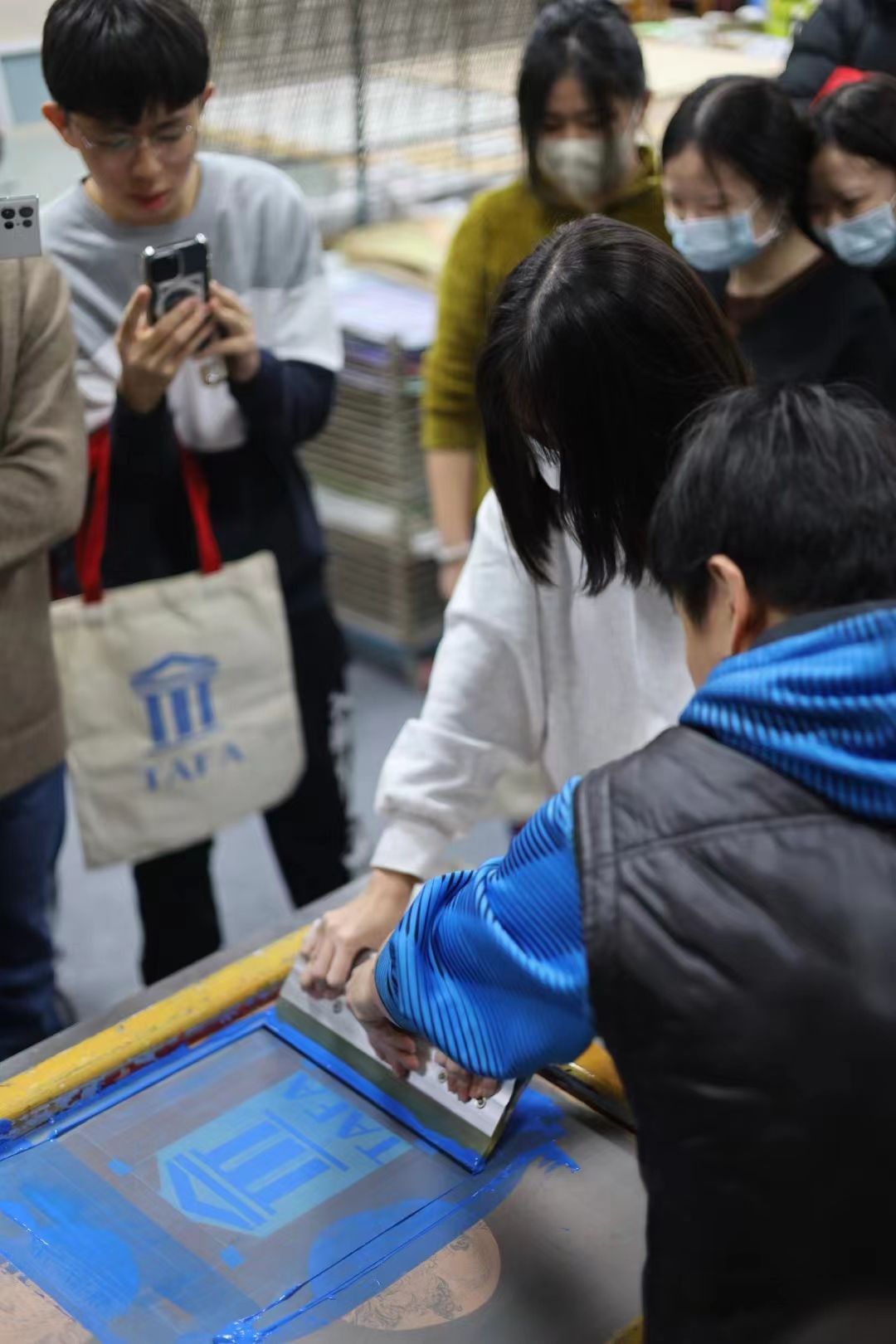 造型艺术学院师生为代表团精心准备了丝网版画、木版印刷艺术体验。版画系杜超老师带领学生参观了版画实验室,介绍了版画的分类以及基本知识,重点介绍了丝网版画的技法,带领学生亲身体验并完成自己的作品。