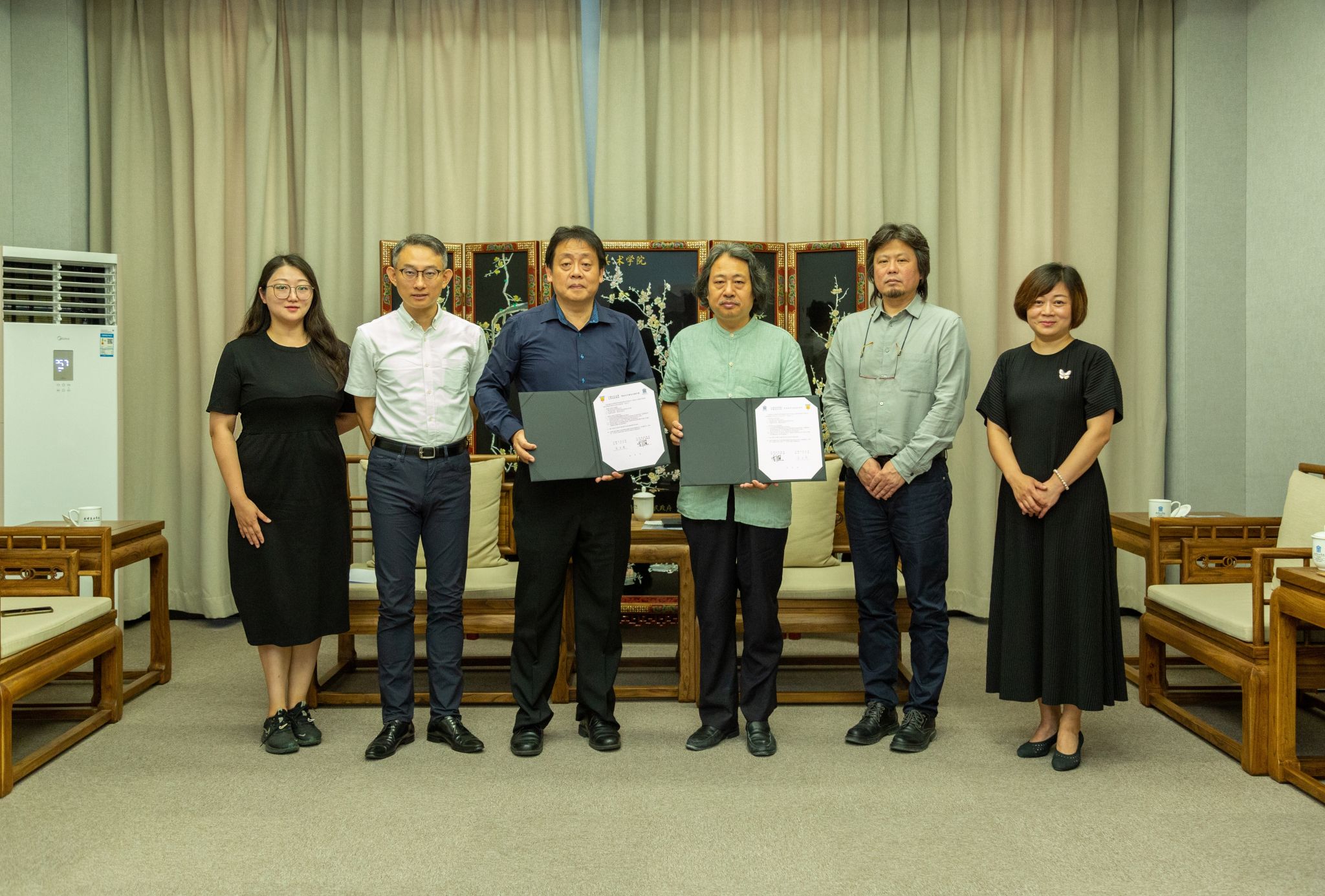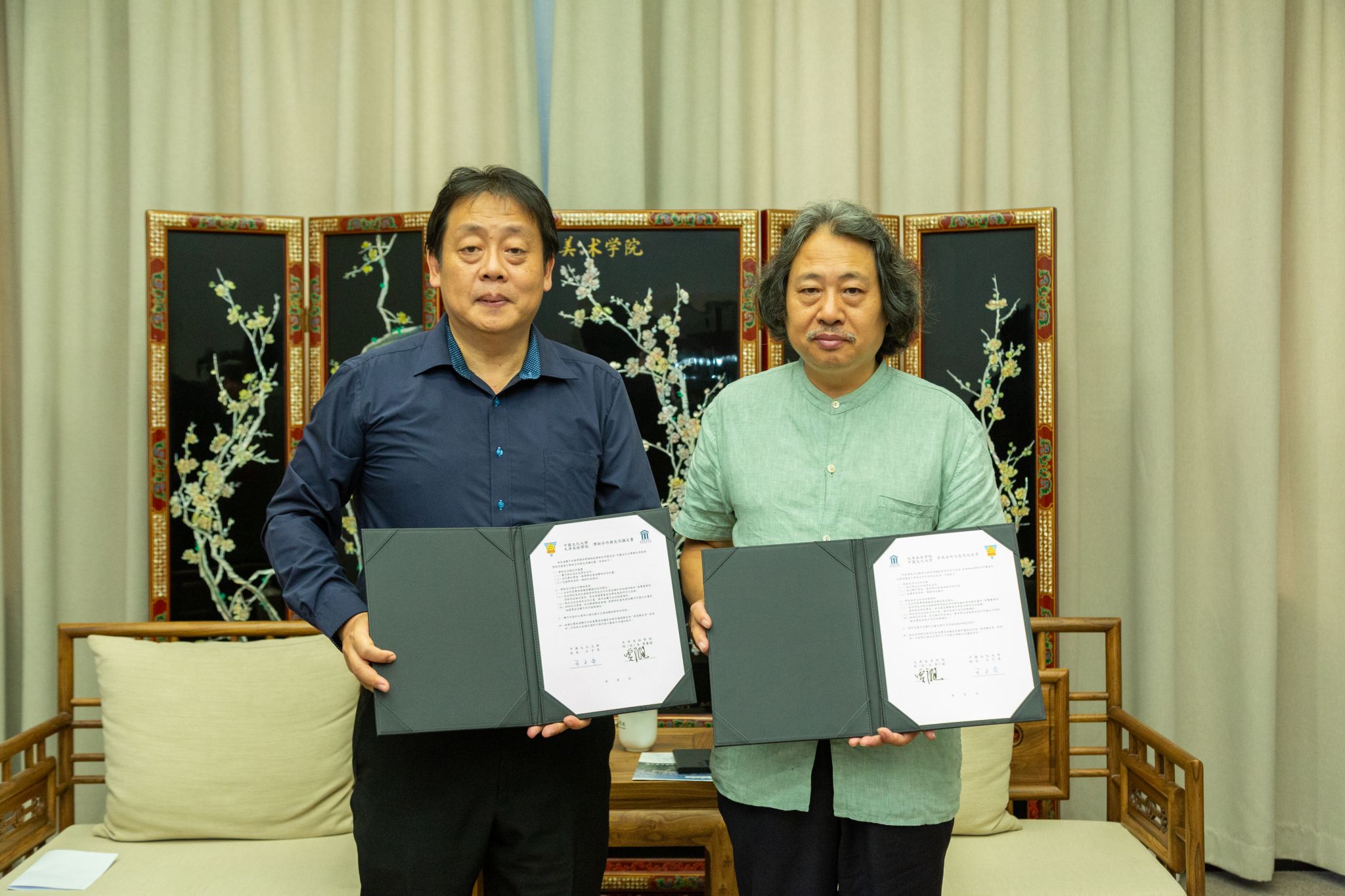 贾广健对中国文化大学校长王子奇一行的到来表示诚挚的欢迎。随后从学校的发展脉络、学科布局、人才培养等方面进行了详细介绍,重点介绍了Beat365中国画、书画修复与鉴赏、历史建筑保护工程等专业的发展近况。他表示近年来Beat365重视与台湾地区高校交流合作,开展了一系列的教学科研合作。本次两校签署了《学术合作与交流协议》《短期研修与短期交流协议》,为今后双方在教师交流、科研项目、学生互换等多领域的交流与合作搭建了坚实的基础。希望未来两校做好学生的交流与交换,同时加强艺术交流。