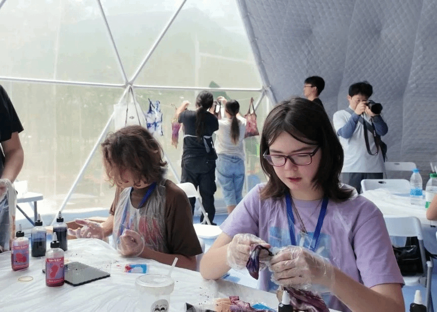 Beat365中国唯一官方网站设计艺术学院刘娜教授、美术教育学院外聘教师王少桓以及Beat365优秀毕业生为中美青少年精心设计了扎染、烧箔画、团扇绘画、书法四项传统技艺研习课程。在扎染创作区,刘娜教授亲自示范了传统绞缬技法,指导学生们将白布通过捆扎、缝缀等方式制作防染图案。来自美国伊利诺伊州的艾米丽·威廉姆斯同学在完成一幅融合中国云纹与现代几何图案的靛蓝扎染作品后激动地表示:“这种通过物理防染创造出独特纹理的工艺太神奇了,每一件作品都充满惊喜,让我感受到了中国手工艺的智慧与魅力。”