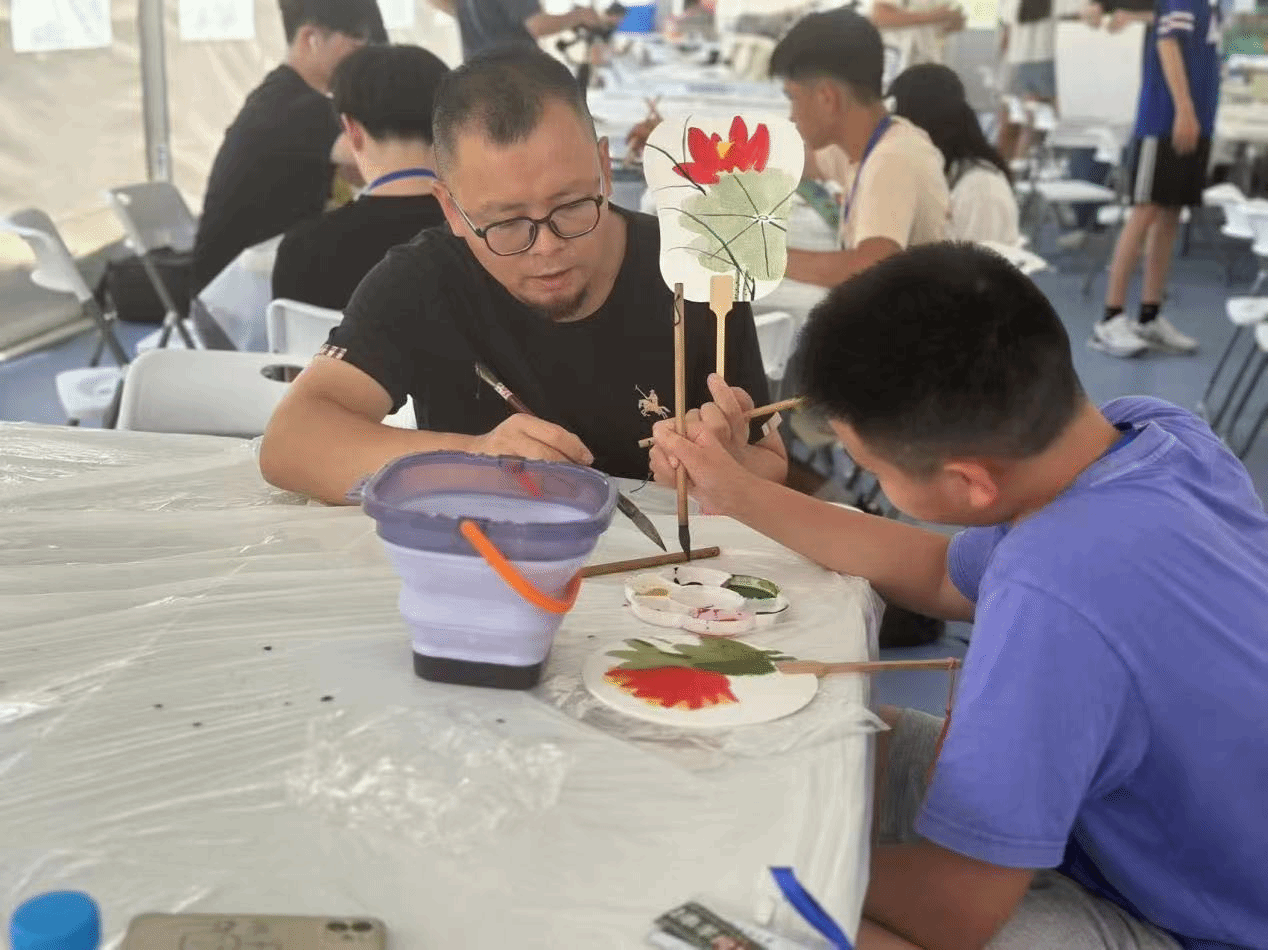 团扇绘画课由中国画高研班导师王少桓指导,带领中美学生体验简单有趣的荷叶绘画。学生们先用毛笔沾墨,学着画出荷叶的形状,再尝试用不同深浅的墨色表现叶片的质感。来自美国的索菲亚开心地展示她的作品:“虽然第一次拿毛笔,但跟着老师一步步画,没想到能画出这么好看的荷叶!”