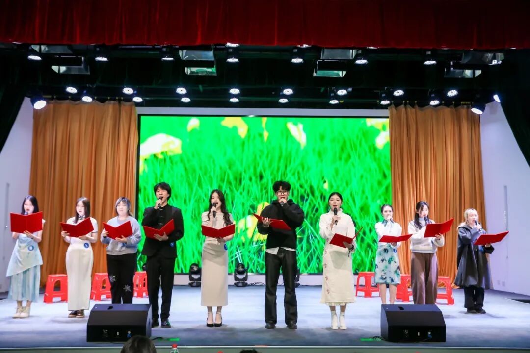 压轴登场的集体朗诵《奔跑吧青春:不负韶华》,将现场氛围推向顶峰!十位同学并肩而立,眼神坚定、声线铿锵,把新时代青年的热血担当、逐梦初心融入每一句朗诵。整齐的节奏、饱满的情感,不仅展现了默契的团队协作力,更道出了天美学子“不负韶华,砥砺前行”的心声。