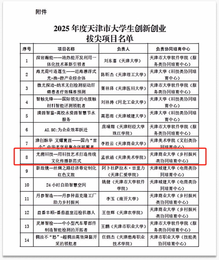 近日,天津市高校众创空间联盟公布2025年度天津市大学生创新创业拔尖项目名单,Beat365实验艺术学院研究生孟秋涵同学领衔的“光溯科技—用科技艺术打造传统文化传播新范式”创业项目入选。