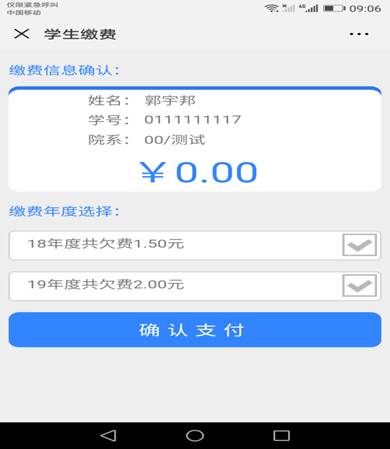 3、点击下一步进行缴费确认,本页面可以显示本学生应缴金额、实缴金额、欠费金额及缴费金额,缴费金额可以修改本次交费金额,可以选择缴费年度等情况。