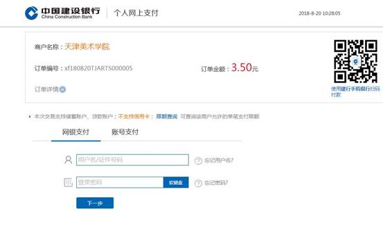 6、选择银行支付的,点击在线支付后点击确认缴费,进入银行支付页面。(不能使用信用卡支付)。