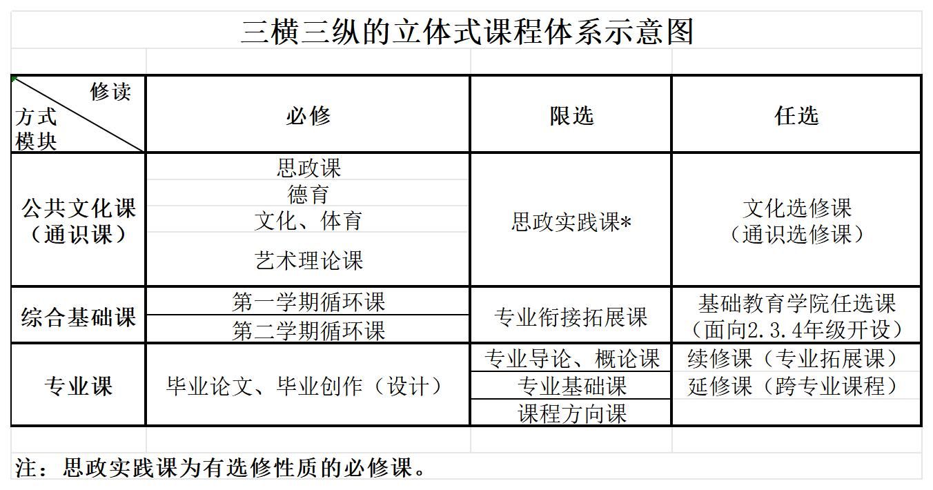 一个平台就是学分制管理模式,三个模块即由公共文化课(通识课)、综合基础课、专业课的分层次课程体系。其中公共文化课(通识课)模块注重学生的全面培养,涵盖思政课、德育课(含军训、军事课、职业生涯规划、大学生心理健康教育课程、劳动课程)、体育课、艺术理论课。综合基础课程面向相应专业大类内各专业,依照“二循环一拓展”模式奠定学生专业理论和技能的基础。专业课程模块涵盖专业基础课、课程方向课、专业任选课。将创新创业教育、课程思政、劳动教育等元素融入各类课程中。通过将课程整合和个性化培养有机地结合起来,达到培养高素质艺术人才的教学目的。
