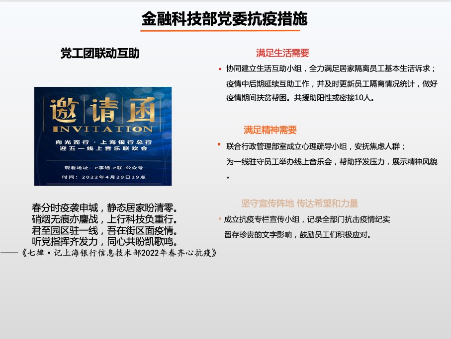 上海银行党员代表贺绮萌同志从组织架构与党建活动方面介绍了上海银行金融科技部党建情况。她提到,金融科技部党委以党建工作统领中心工作,把坚持党的领导、加强党的建设贯穿于信息科技管理工作全过程,聚焦党建与中心工作双向融合。通过开展“理想信念照前路”主题学习教育、“我为群众办实事”系列实践活动及岗位建功等系列活动来增强支部活力。上海银行金融科技部第三党支部书记杨扬同志进一步介绍了苏州分中心支部党建情况,包括扁平化管理方案、最新组织架构,以及围绕中心工作所取得的党建工作成果。